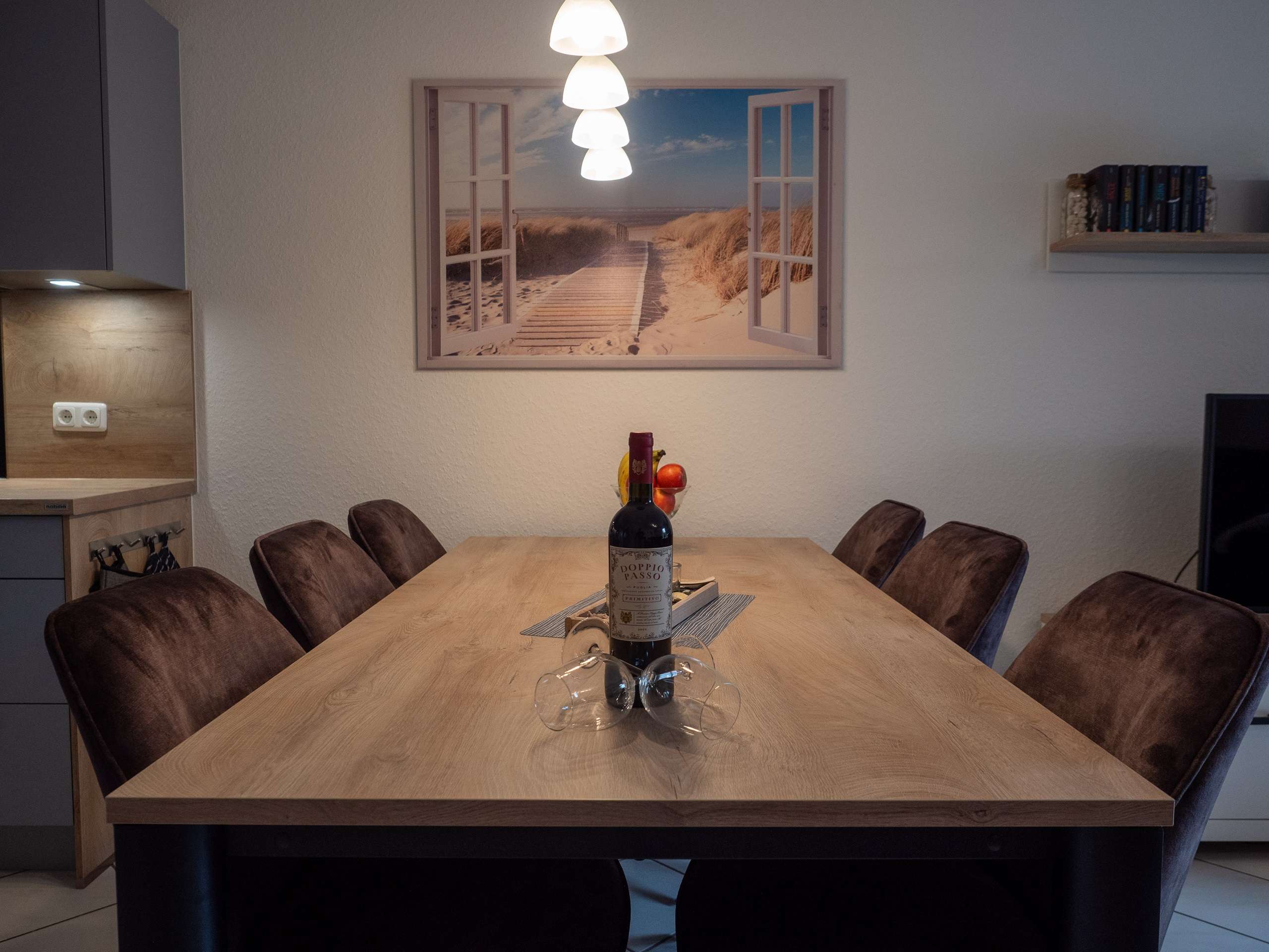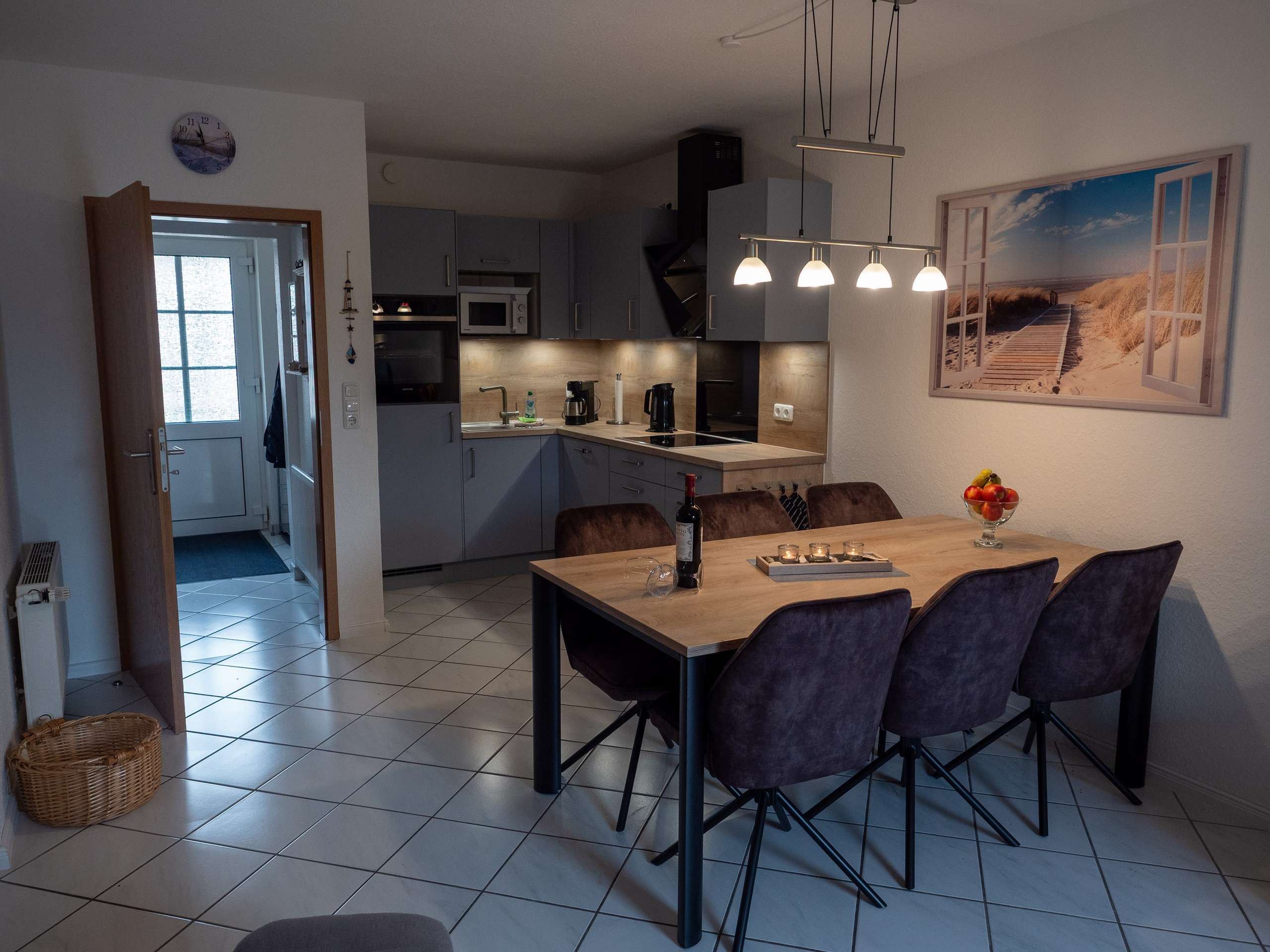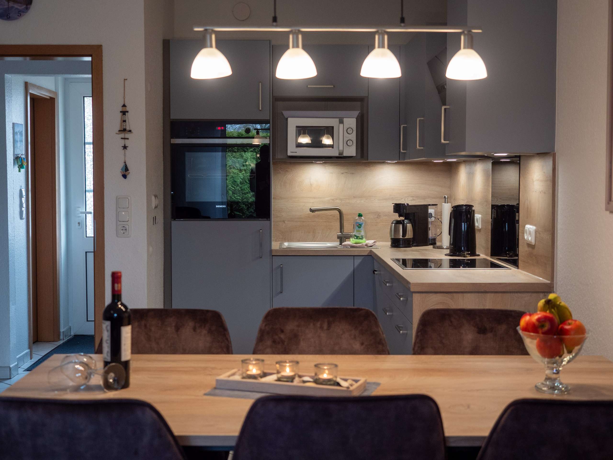 Die neue und moderne Einbauküche ist komplett eingerichtet mit Geschirrspüler, Kühlschrank mit ****Gefrierfach, 4-Platten-Herd, Backofen, Mikrowelle, Kaffeemaschine für Filterkaffee und Kaffeepads, Toaster, Eier- und Wasserkocher, Unterbauleuchten. Selbstverständlich haben wir für ausreichend Geschirr, Gläser, Besteck, Töpfe, Pfannen, Auflaufform sowie digitaler Küchenwaage und gut sortierten Küchenutensilien gesorgt.